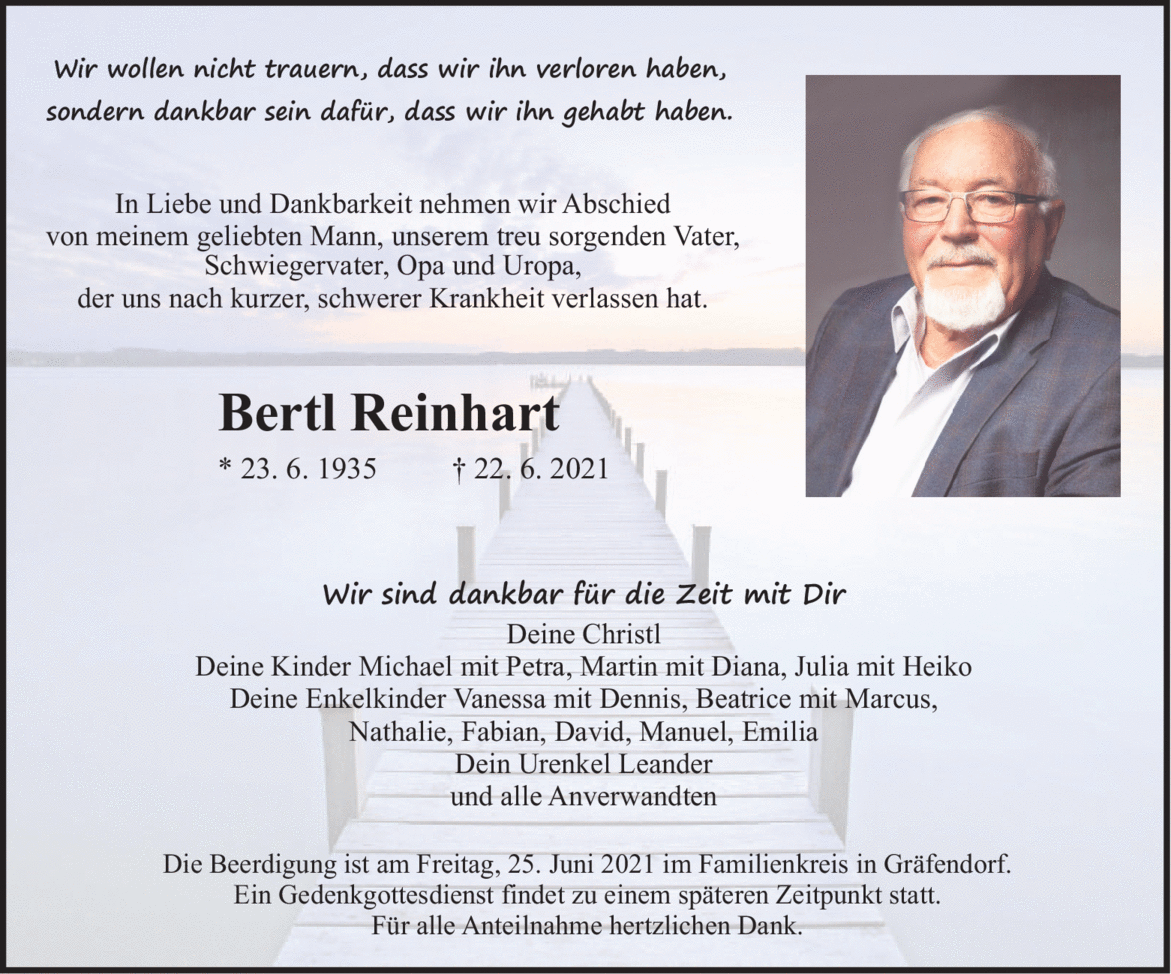 Völlig überraschend wurde Berthold Reinhart aus unserer Mitte gerissen. Er verstarb nach kurzer schwerer Krankheit am 22.06.2021, einen Tag vor seinem 86. Geburtstag. Bertl spielte Bariton in unserer Fischertrachtenkapelle.