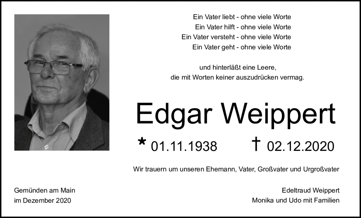 Edgar Weippert ging am 02.12.2020 im Alter von 82 Jahren von uns. Mit ihm verlieren wir den Sänger und Akkordeonisten unserer Saitenmusikgruppe, der er seit über 10 Jahren angehörte.