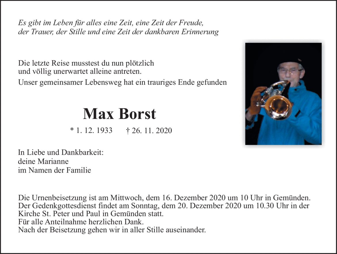 Max Borst verstarb am 26.11.2020 kurz vor seinem 87. Geburtstag. Er spielte seit über 20 Jahren Trompete in unserer Fischertrachtenkapelle.