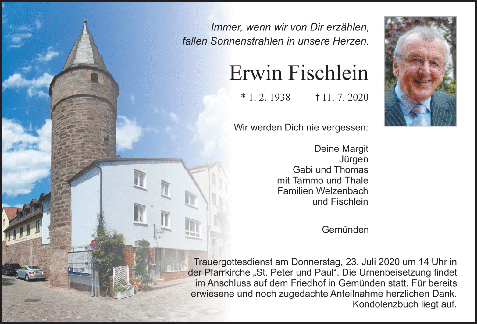 Erwin Fischlein war seit über 40 Jahren Mitglied unseres Vereins. Im Alter von 82 Jahren fand er am 23.07.2020 seine letzte Ruhe auf dem Friedhof in Gemünden.